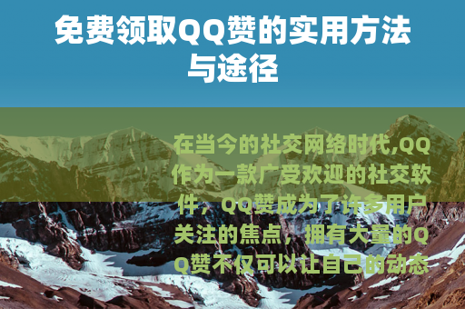 在当今的社交网络时代,QQ作为一款广受欢迎的社交软件,QQ赞成为了许多用户关注的焦点,拥有大量的QQ赞不仅可以让自己的动态更加醒目,还能在一定程度上体现自己的社交活跃度和受欢迎程度,而对于很多人来说,免费领取QQ赞无疑是一个极具吸引力的事情。