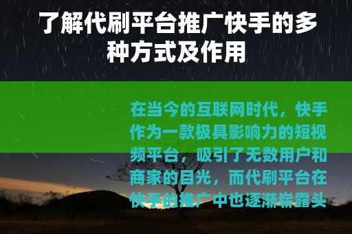 在当今的互联网时代,快手作为一款极具影响力的短视频平台,吸引了无数用户和商家的目光,而代刷平台在快手的推广中也逐渐崭露头角,为众多希望在快手上获得更多关注和流量的人提供了一种途径。