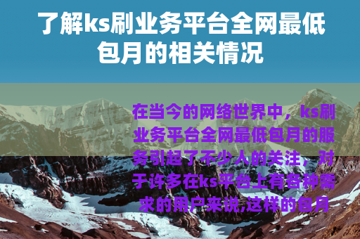 在当今的网络世界中,ks刷业务平台全网最低包月的服务引起了不少人的关注,对于许多在ks平台上有各种需求的用户来说,这样的包月服务似乎提供了一种便捷且经济实惠的途径来提升自己在平台上的影响力。