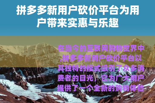 在当今的互联网购物世界中,拼多多新用户砍价平台以其独特的模式吸引了众多消费者的目光,它为广大用户提供了一个全新的购物体验,让人们在享受购物的同时,还能通过砍价获得更多的实惠。