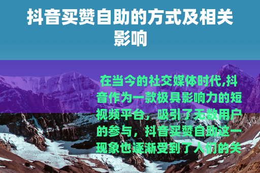 在当今的社交媒体时代,抖音作为一款极具影响力的短视频平台,吸引了无数用户的参与,抖音买赞自助这一现象也逐渐受到了人们的关注。