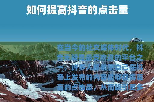 在当今的社交媒体时代,抖音无疑是最受欢迎的平台之一,许多人都希望自己在抖音上发布的内容能够获得更高的点击量,从而吸引更多的关注和粉丝,怎么可以把抖音的点击量提高呢?以下是一些实用的方法。 质量是关键,要确保你的视频内容具有独特性、趣味性和实用性,独特的内容能够让用户在众多视频中眼前一亮,趣味性则会吸引他们停留观看,而实用性的内容往往更容易被用户分享,你可以分享一些生活小妙招、美食制作教程、美妆技巧等,这些都是用户比较感兴趣的话题。