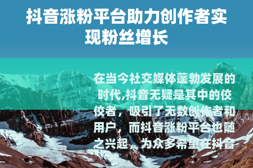 抖音涨粉平台在抖音的发展历程中扮演着重要的角色,它为创作者们提供了成长和发展的土壤,为抖音生态的繁荣注入了强大的动力,在未来,抖音涨粉平台将继续发挥其积极作用,与创作者们携手共进,共同创造出更加丰富多彩的抖音世界,为广大用户带来更多的欢乐和价值,我们有理由相信,在抖音涨粉平台的助力下,抖音的明天会更加美好,会有更多优秀的创作者在这个平台上绽放光彩,收获属于自己的成功和荣耀。