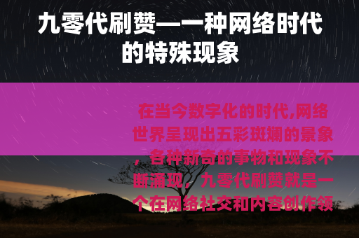 在当今数字化的时代,网络世界呈现出五彩斑斓的景象,各种新奇的事物和现象不断涌现,九零代刷赞就是一个在网络社交和内容创作领域中具有一定影响力的特殊现象。