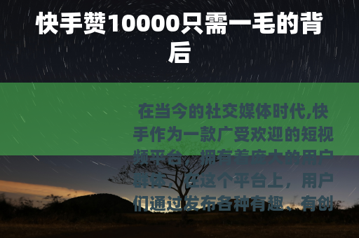 虽然快手赞10000只需一毛的服务看似诱人,但我们在面对这种情况时,还是要保持理性和冷静,我们应该更加注重视频内容的质量和用户的真实互动,通过不断地提升自己的创作能力和水平,制作出更有价值、更受欢迎的视频,来吸引真实用户的点赞和关注,我们才能在快手这个平台上真正实现自己的价值,获得长期的发展和成功。