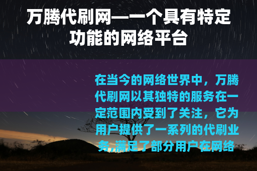 万腾代刷网作为一个在网络世界中具有一定影响力的代刷平台,为用户提供了多种代刷服务,在操作、技术、用户体验等方面都有其独特之处,但用户在使用时要权衡利弊,合理利用其服务,以实现自身在网络世界中的发展和目标,同时也要注重维护网络环境的健康和公平。
