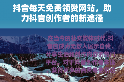 在当今的社交媒体时代,抖音已成为无数人展示自我、分享生活和创作内容的热门平台,对于抖音创作者来说,获得更多的点赞是他们追求的目标之一,因为点赞不仅代表着观众的喜爱和认可,还能帮助作品获得更多的曝光和流量,而抖音每天免费领赞网站的出现,为创作者们提供了一种新的途径来提升自己作品的点赞数。