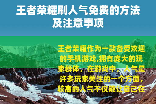 王者荣耀作为一款备受欢迎的手机游戏,拥有庞大的玩家群体,在游戏中,人气是许多玩家关注的一个方面,较高的人气不仅能让自己在游戏社区中更有存在感,还可能带来一些额外的游戏乐趣,我们就来聊聊王者荣耀刷人气免费的相关话题。