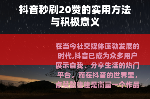 在当今社交媒体蓬勃发展的时代,抖音已成为众多用户展示自我、分享生活的热门平台,而在抖音的世界里,点赞数往往是衡量一个作品受欢迎程度的重要指标之一,抖音秒刷20赞这样的操作,对于许多创作者来说,具有一定的吸引力和积极作用。