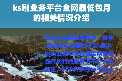 在当今的网络世界中,各种刷业务平台层出不穷,其中ks刷业务平台以其全网最低包月的特点吸引了不少人的关注。