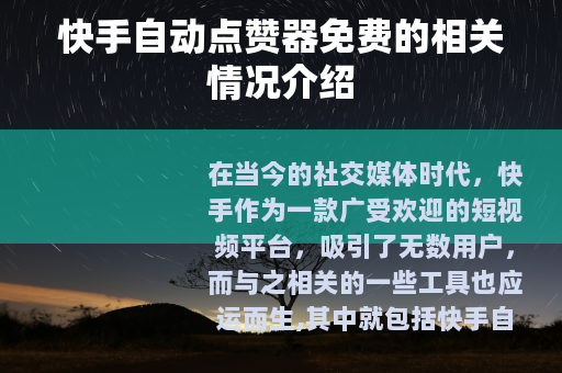 在当今的社交媒体时代,快手作为一款广受欢迎的短视频平台,吸引了无数用户,而与之相关的一些工具也应运而生,其中就包括快手自动点赞器免费版。