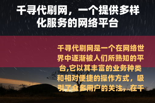 千寻代刷网是一个在网络世界中逐渐被人们所熟知的平台,它以其丰富的业务种类和相对便捷的操作方式,吸引了众多用户的关注。
