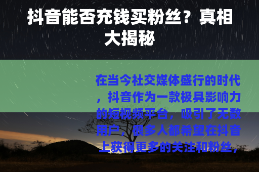 在当今社交媒体盛行的时代,抖音作为一款极具影响力的短视频平台,吸引了无数用户,很多人都希望在抖音上获得更多的关注和粉丝,从而提升自己的影响力,一个问题便应运而生:抖音可以充钱买粉丝吗?