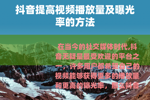 在当今的社交媒体时代,抖音无疑是最受欢迎的平台之一,许多用户都希望自己的视频能够获得更多的播放量和更高的曝光率,那么抖音有哪些有效的手段可以实现这一目标呢?