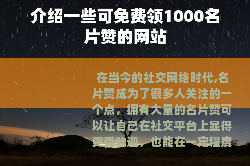 免费领1000名片赞的网站为广大用户提供了一个提升社交影响力的好机会,它们以免费的方式满足了用户的需求,在社交网络中发挥着独特的作用,只要用户合理利用这些网站,就能够在社交平台上获得更多的关注和认可,让自己的社交生活更加丰富多彩。 能满足你的需求,你可以根据实际情况进行调整和修改,需要注意的是,在现实网络环境中,一些非正规渠道获取名片赞的行为可能存在违反平台规定等风险,我们应遵守法律法规和平台规则,合法合规地进行网络活动。