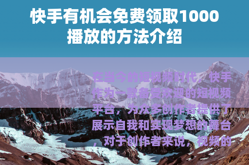 在当今的短视频时代,快手作为一款备受欢迎的短视频平台,为众多创作者提供了展示自我和实现梦想的舞台,对于创作者来说,视频的播放量是衡量作品受欢迎程度和影响力的重要指标之一,而能够免费领取1000播放量,无疑是一件非常有吸引力的事情,下面就来为大家介绍一些在快手上可能免费领取1000播放的途径和方法。