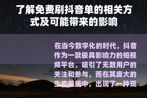 在当今数字化的时代,抖音作为一款极具影响力的短视频平台,吸引了无数用户的关注和参与,而在其庞大的生态系统中,出现了一种现象,那就是免费刷抖音单。