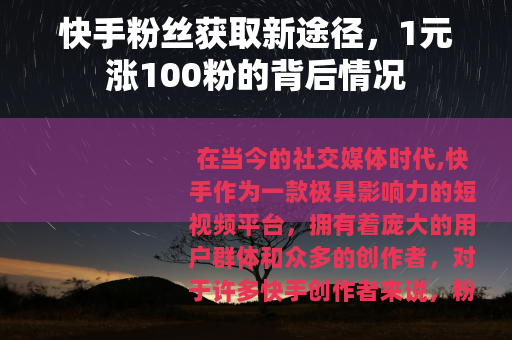 在当今的社交媒体时代,快手作为一款极具影响力的短视频平台,拥有着庞大的用户群体和众多的创作者,对于许多快手创作者来说,粉丝数量是衡量其在平台上影响力和成功与否的一个重要指标,而在这个追求粉丝量的潮流中,出现了一种看似非常诱人的现象,那就是1元涨100个快手粉丝。