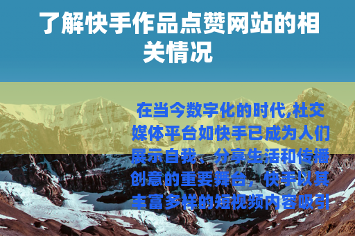 快手作品点赞网站在一定程度上为快手创作者提供了一种获取点赞数的途径,但同时也带来了一系列的问题和挑战,创作者和平台都需要正确认识和对待这些网站,在追求点赞数增长的同时,更要注重作品质量和平台生态的健康发展,以实现快手平台的长期繁荣和用户的共同成长,我们才能在快手这个充满活力的社交平台上,看到更多优秀的作品,感受到更多的创意和温暖。