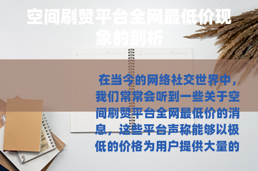 在当今的网络社交世界中,我们常常会听到一些关于空间刷赞平台全网最低价的消息,这些平台声称能够以极低的价格为用户提供大量的点赞数,从而帮助用户在社交空间中获得更高的关注度和人气,这种看似诱人的服务背后,却隐藏着许多值得我们深入思考的问题。