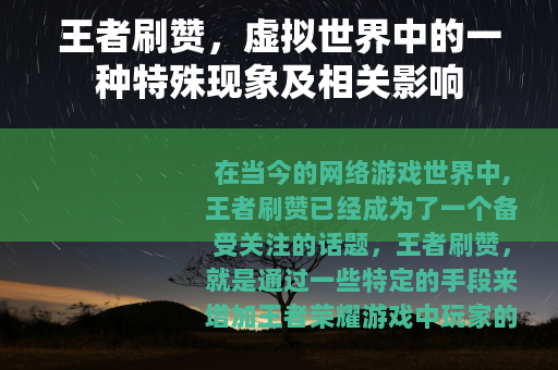 在当今的网络游戏世界中,王者刷赞已经成为了一个备受关注的话题,王者刷赞,就是通过一些特定的手段来增加王者荣耀游戏中玩家的点赞数量,这一现象在王者玩家群体中逐渐兴起,有着其独特的发展历程和多方面的影响。