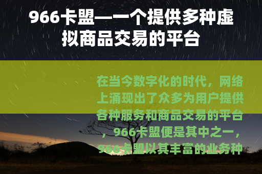 在当今数字化的时代,网络上涌现出了众多为用户提供各种服务和商品交易的平台,966卡盟便是其中之一,966卡盟以其丰富的业务种类和相对便捷的交易模式,吸引了不少用户的关注。