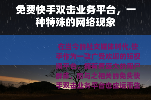 在当今的社交媒体时代,快手作为一款广受欢迎的短视频平台,拥有着庞大的用户群体,而与之相关的免费快手双击业务平台也应运而生,成为了一个备受关注的话题。