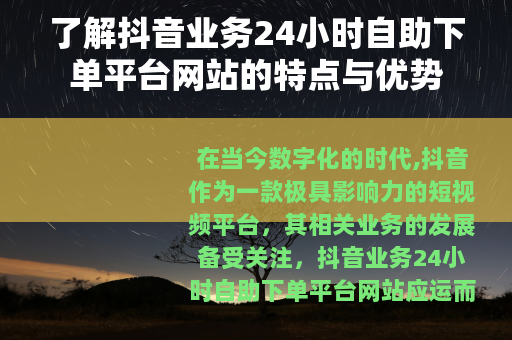 在当今数字化的时代,抖音作为一款极具影响力的短视频平台,其相关业务的发展备受关注,抖音业务24小时自助下单平台网站应运而生,为众多用户提供了便捷的服务。