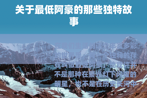 在我们生活的这个丰富多彩的世界里,有一个独特的存在叫做最低阿豪,他或许并不是那种在聚光灯下闪耀的明星,也不是在历史长河中留下浓墨重彩的传奇人物,但他却有着属于自己的别样魅力,在他所生活的小天地里散发着独特的光芒。
