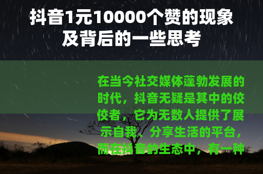 在当今社交媒体蓬勃发展的时代,抖音无疑是其中的佼佼者,它为无数人提供了展示自我、分享生活的平台,而在抖音的生态中,有一种现象引起了广泛的关注,那就是所谓的“抖音1元10000个赞”。