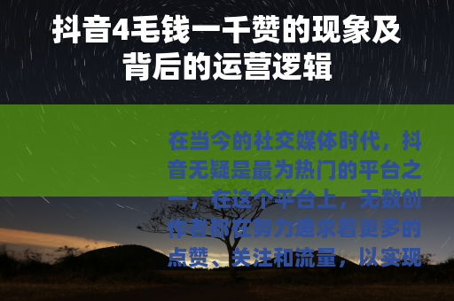 在当今的社交媒体时代,抖音无疑是最为热门的平台之一,在这个平台上,无数创作者都在努力追求着更多的点赞、关注和流量,以实现自己的创作价值和商业目标,而其中,“抖音4毛钱一千赞”的现象逐渐引起了人们的关注。