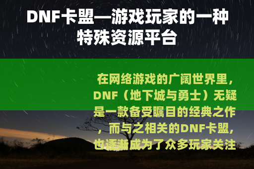 在网络游戏的广阔世界里,DNF(地下城与勇士)无疑是一款备受瞩目的经典之作,而与之相关的DNF卡盟,也逐渐成为了众多玩家关注的一个重要领域。