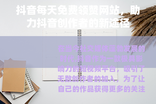 在当今社交媒体蓬勃发展的时代,抖音作为一款极具影响力的短视频平台,吸引了无数创作者的加入,为了让自己的作品获得更多的关注和认可,点赞数成为了一个重要的衡量指标,而抖音每天免费领赞网站的出现,为创作者们提供了一个额外的助力渠道。