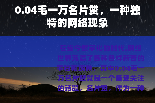 在当今数字化的时代,网络世界充满了各种各样新奇的事物和现象,其中0.04毛一万名片赞就是一个备受关注的话题,名片赞,作为一种在社交网络平台上体现个人受欢迎程度的方式,在网络社交中有着独特的地位,而0.04毛一万名片赞的出现,更是引发了众多用户的兴趣和讨论。