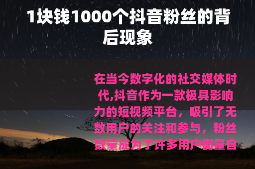 在当今数字化的社交媒体时代,抖音作为一款极具影响力的短视频平台,吸引了无数用户的关注和参与,粉丝数量成为了许多用户衡量自身在平台上影响力和价值的重要指标之一,而市场上出现了一种声称1块钱就能买到1000个抖音粉丝的现象,这引起了广泛的讨论和不同的看法。