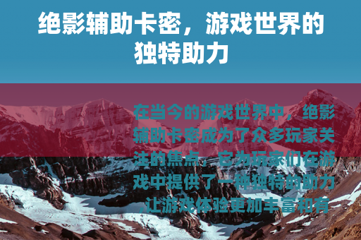 在当今的游戏世界中,绝影辅助卡密成为了众多玩家关注的焦点,它为玩家们在游戏中提供了一种独特的助力,让游戏体验更加丰富和有趣。