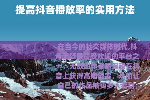 在当今的社交媒体时代,抖音无疑是最受欢迎的平台之一,无数创作者都渴望在抖音上获得高播放率,从而让自己的作品被更多人看到,抖音标签怎么提高播放率呢?以下是一些有效的方法。