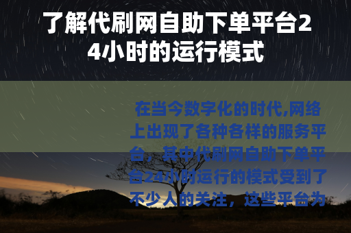 在当今数字化的时代,网络上出现了各种各样的服务平台,其中代刷网自助下单平台24小时运行的模式受到了不少人的关注,这些平台为用户提供了一种便捷的方式,在任何时间都可以进行相关业务的下单操作。