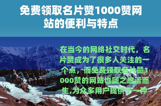免费领取名片赞1000赞的网站在网络社交领域中有着独特的地位和作用,它们以其简便的操作、及时的服务和多样的特点,为广大用户提供了一种轻松提升名片赞数量的途径,为用户的社交生活和网络推广等带来了一定的便利和价值,只要用户能够正确看待和合理使用,就可以在享受其带来的好处的同时,不断丰富和完善自己的网络社交体验。
