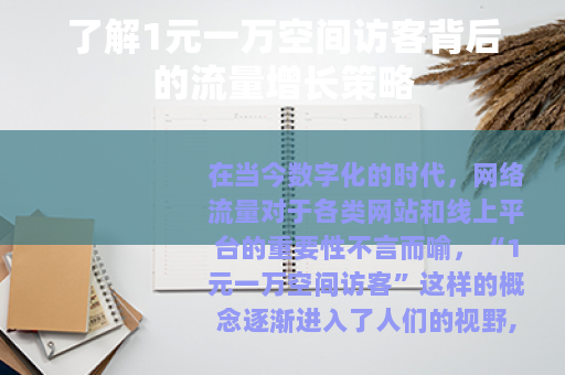 在当今数字化的时代,网络流量对于各类网站和线上平台的重要性不言而喻。“1元一万空间访客”这样的概念逐渐进入了人们的视野,它为许多希望提升网站人气和曝光度的人提供了一种看似极具性价比的选择。