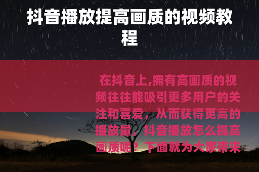 在抖音上,拥有高画质的视频往往能吸引更多用户的关注和喜爱,从而获得更高的播放量,抖音播放怎么提高画质呢?下面就为大家带来详细的视频教程。