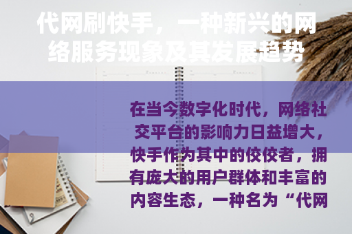 在当今数字化时代,网络社交平台的影响力日益增大,快手作为其中的佼佼者,拥有庞大的用户群体和丰富的内容生态,一种名为“代网刷快手”的服务也悄然兴起,成为了网络世界中一个备受关注的现象。