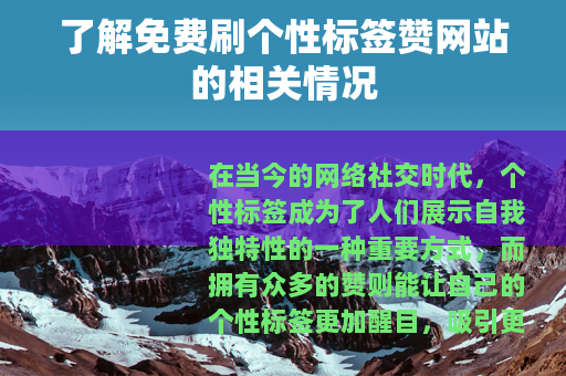 在当今的网络社交时代,个性标签成为了人们展示自我独特性的一种重要方式,而拥有众多的赞则能让自己的个性标签更加醒目,吸引更多人的关注,免费刷个性标签赞的网站应运而生,引发了不少人的兴趣。