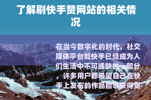在当今数字化的时代,社交媒体平台如快手已经成为人们生活中不可或缺的一部分,许多用户都希望自己在快手上发布的作品能够获得更多的点赞,从而获得更多的关注和认可,在这样的需求下,刷快手赞网站应运而生。