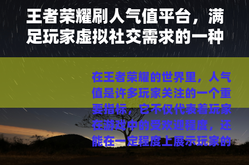 在王者荣耀的世界里,人气值是许多玩家关注的一个重要指标,它不仅代表着玩家在游戏中的受欢迎程度,还能在一定程度上展示玩家的游戏实力和社交影响力,而王者荣耀刷人气值平台,也就在这样的背景下应运而生,为玩家提供了一种快速提升人气值的途径。