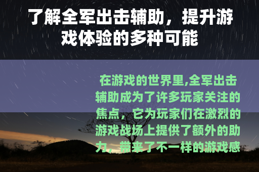 在游戏的世界里,全军出击辅助成为了许多玩家关注的焦点,它为玩家们在激烈的游戏战场上提供了额外的助力,带来了不一样的游戏感受。