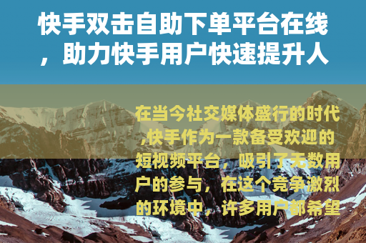 在当今社交媒体盛行的时代,快手作为一款备受欢迎的短视频平台,吸引了无数用户的参与,在这个竞争激烈的环境中,许多用户都希望能够快速提升自己作品的人气,而快手双击自助下单平台在线的出现,为他们提供了一种新的途径。