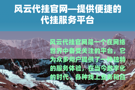 风云代挂官网是一个在网络世界中备受关注的平台,它为众多用户提供了一种独特的服务体验,在当今数字化的时代,各种线上业务和应用层出不穷,而风云代挂官网则在其中找到了自己的定位,满足了一部分用户对于特定代挂需求的追求。