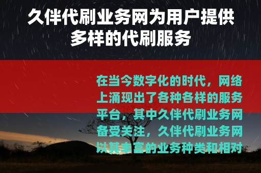 在当今数字化的时代,网络上涌现出了各种各样的服务平台,其中久伴代刷业务网备受关注,久伴代刷业务网以其丰富的业务种类和相对便捷的操作流程,吸引了众多有相关需求的用户。