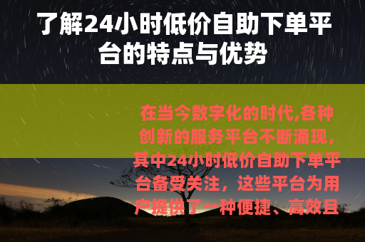 在当今数字化的时代,各种创新的服务平台不断涌现,其中24小时低价自助下单平台备受关注,这些平台为用户提供了一种便捷、高效且经济实惠的购物体验。
